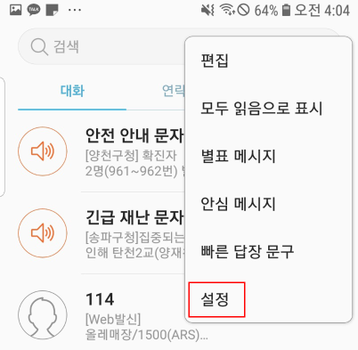 4. 메시지 설정창에서 [긴급 알림 설정] 선택.