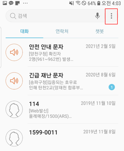 2. [메시지]에서 빨간색 박스 선택.