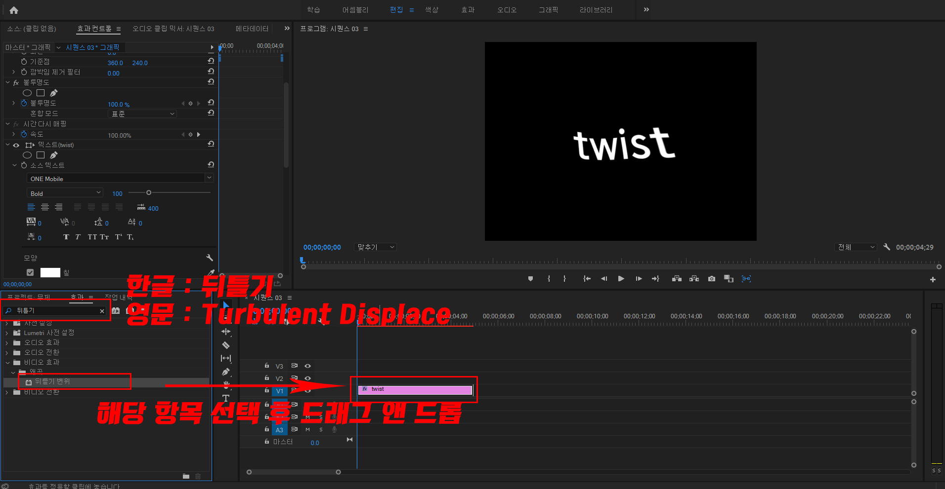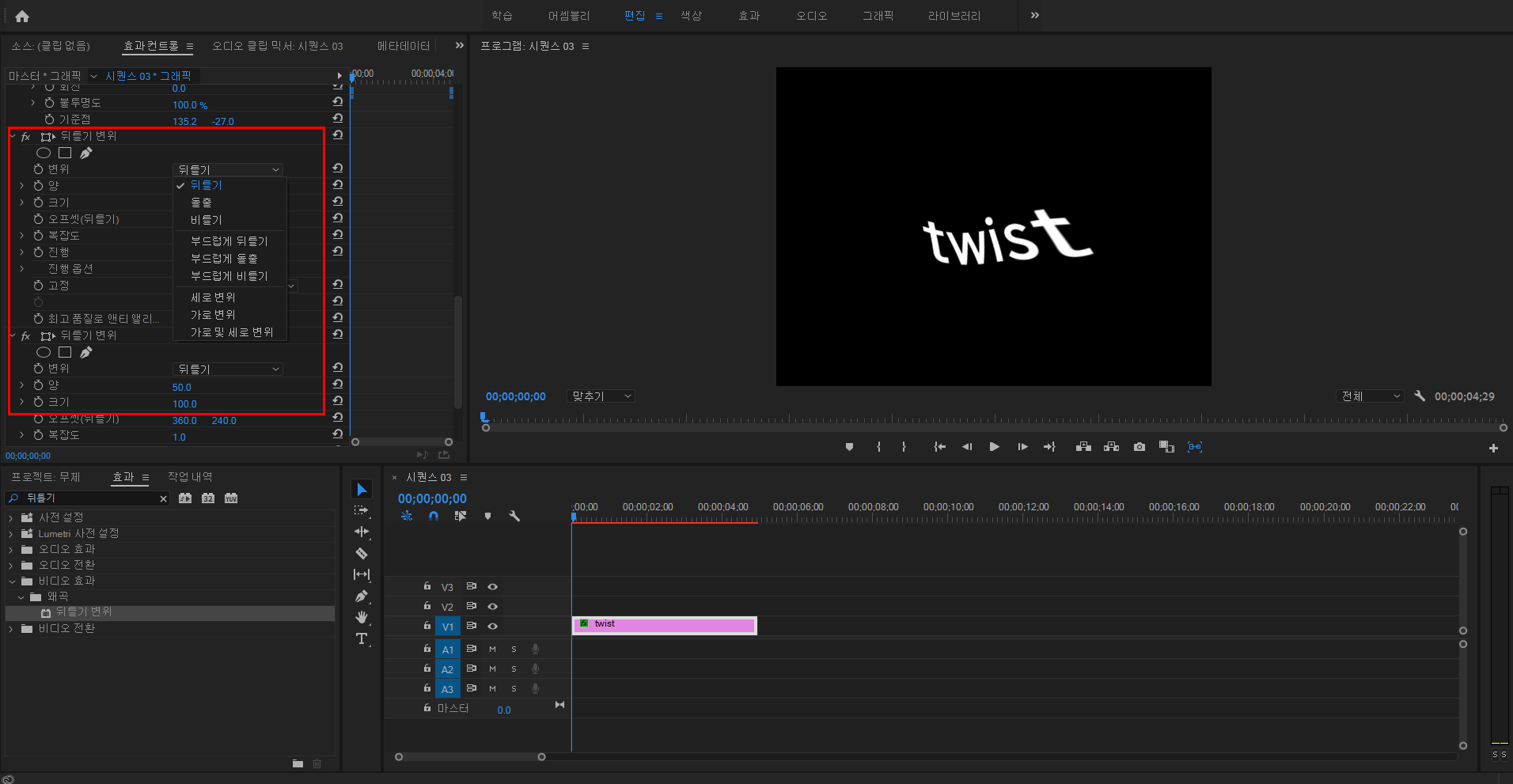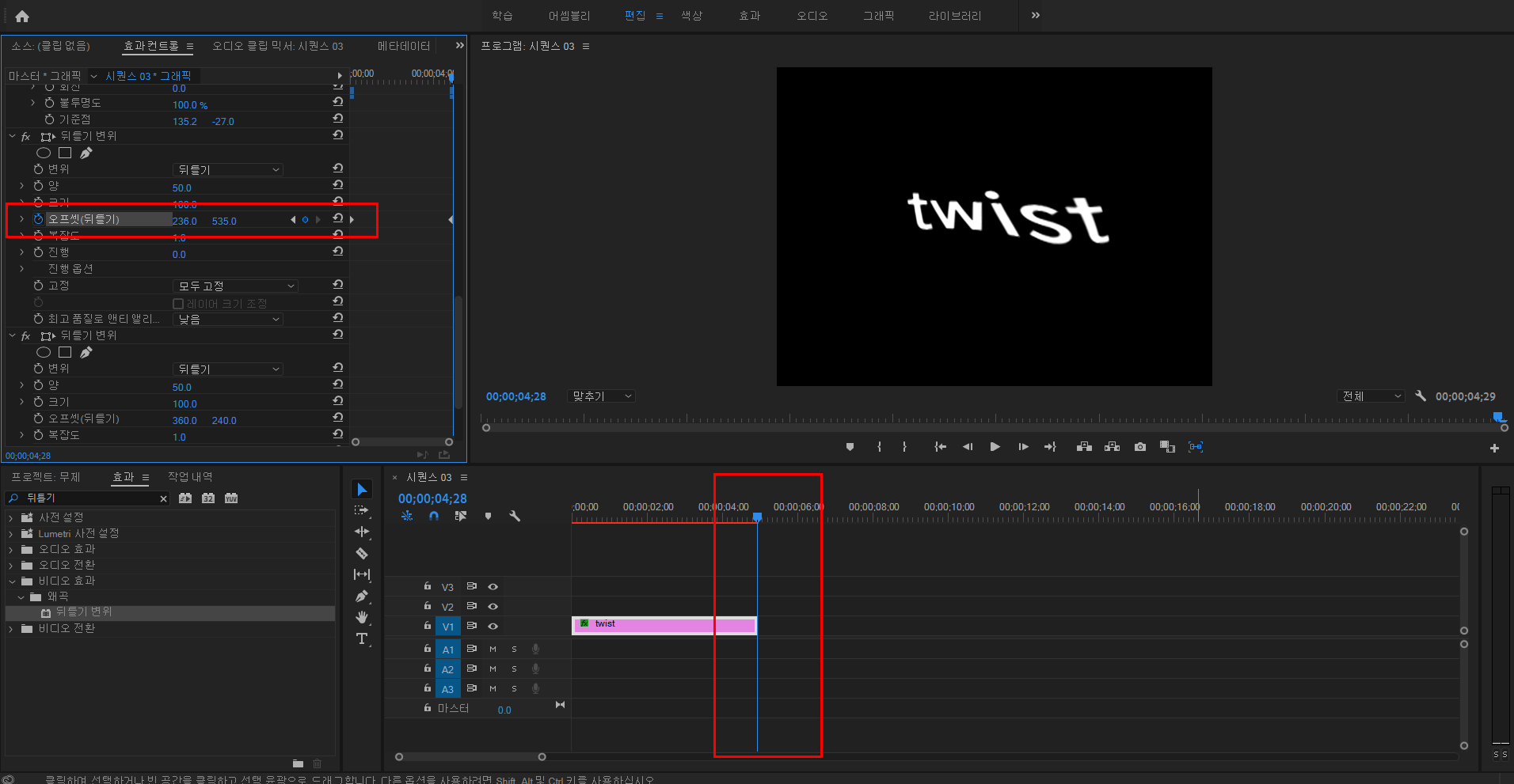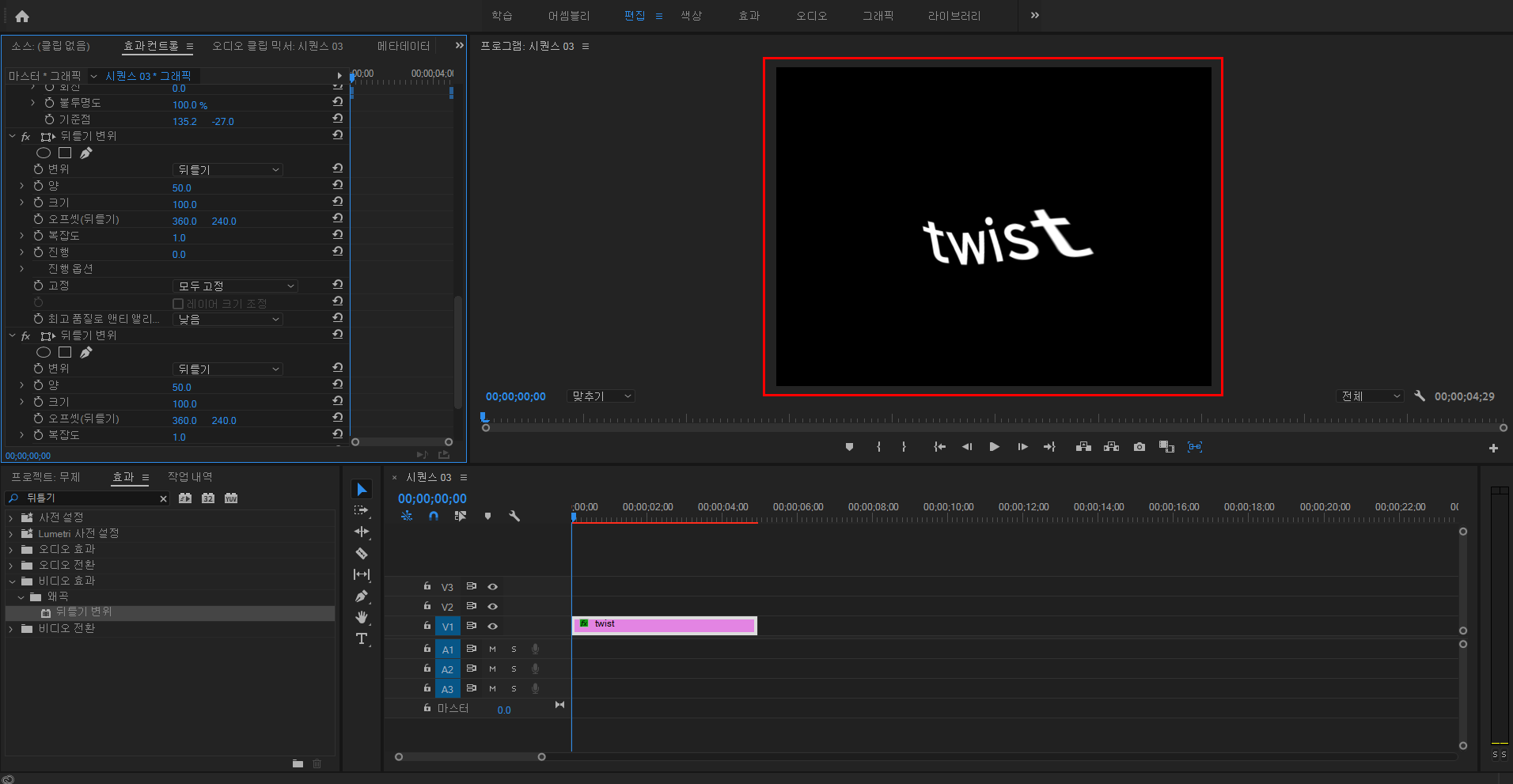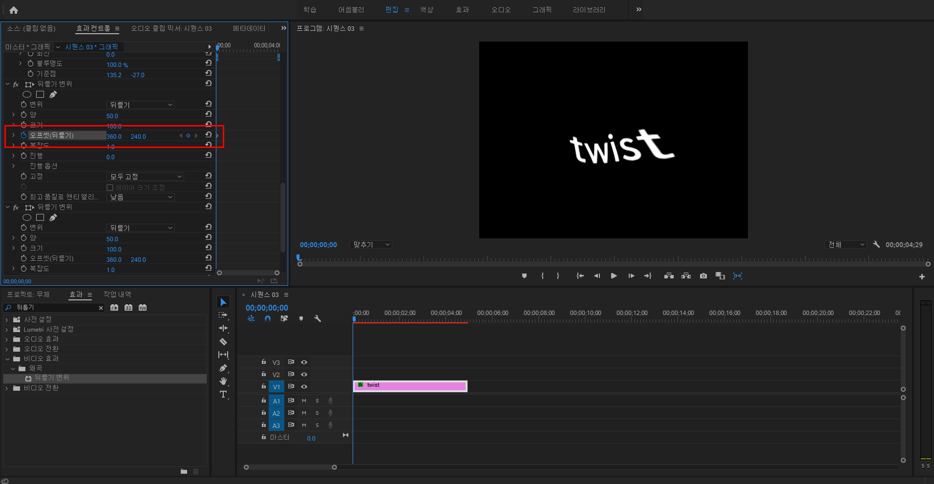 한글 : [효과창] - 검색 항목에 '뒤틀기'로 입력하여 [뒤틀기 변위] 선택 또는 [비디오 효과] - [왜곡] - [뒤틀기 변위]에서 선택
