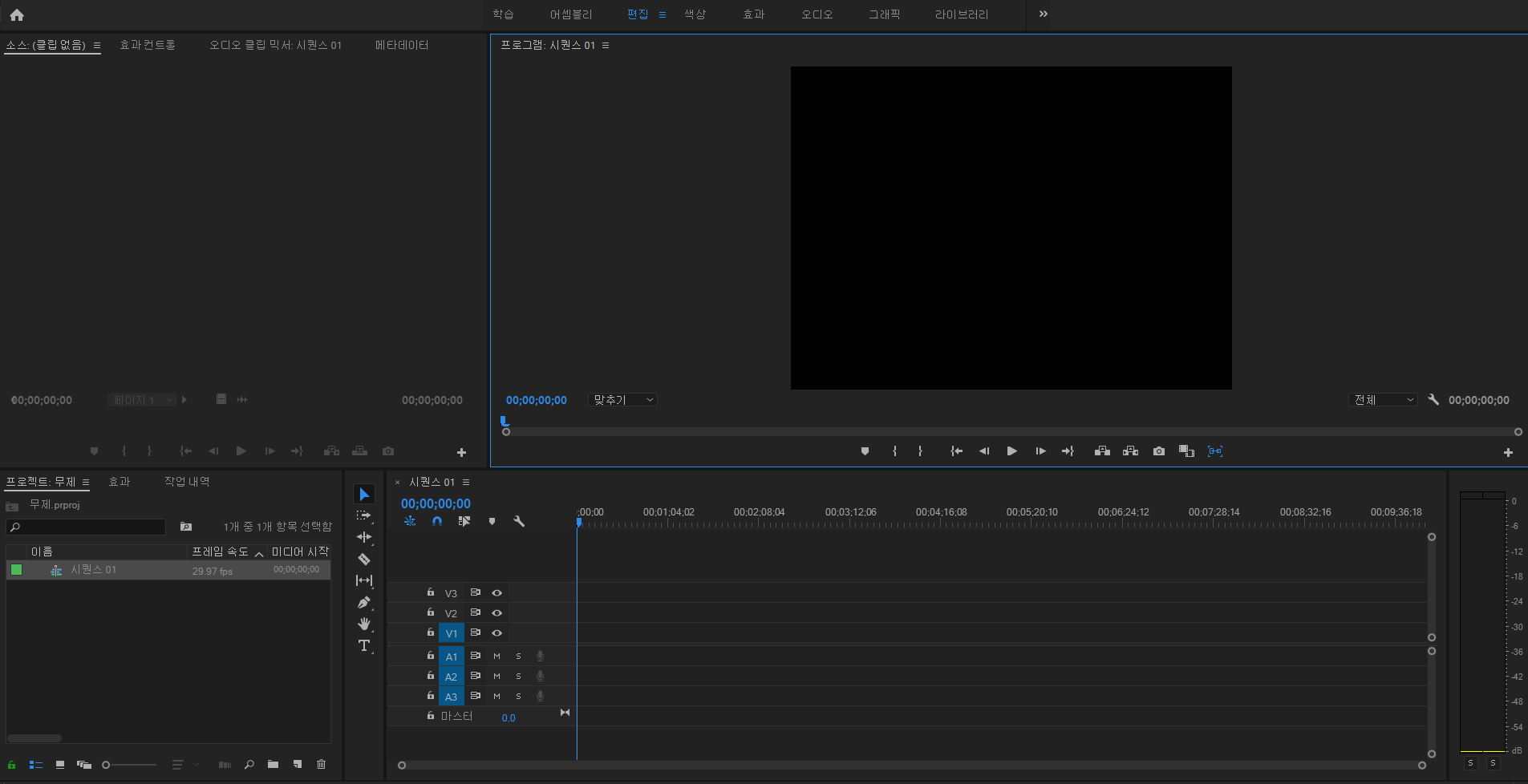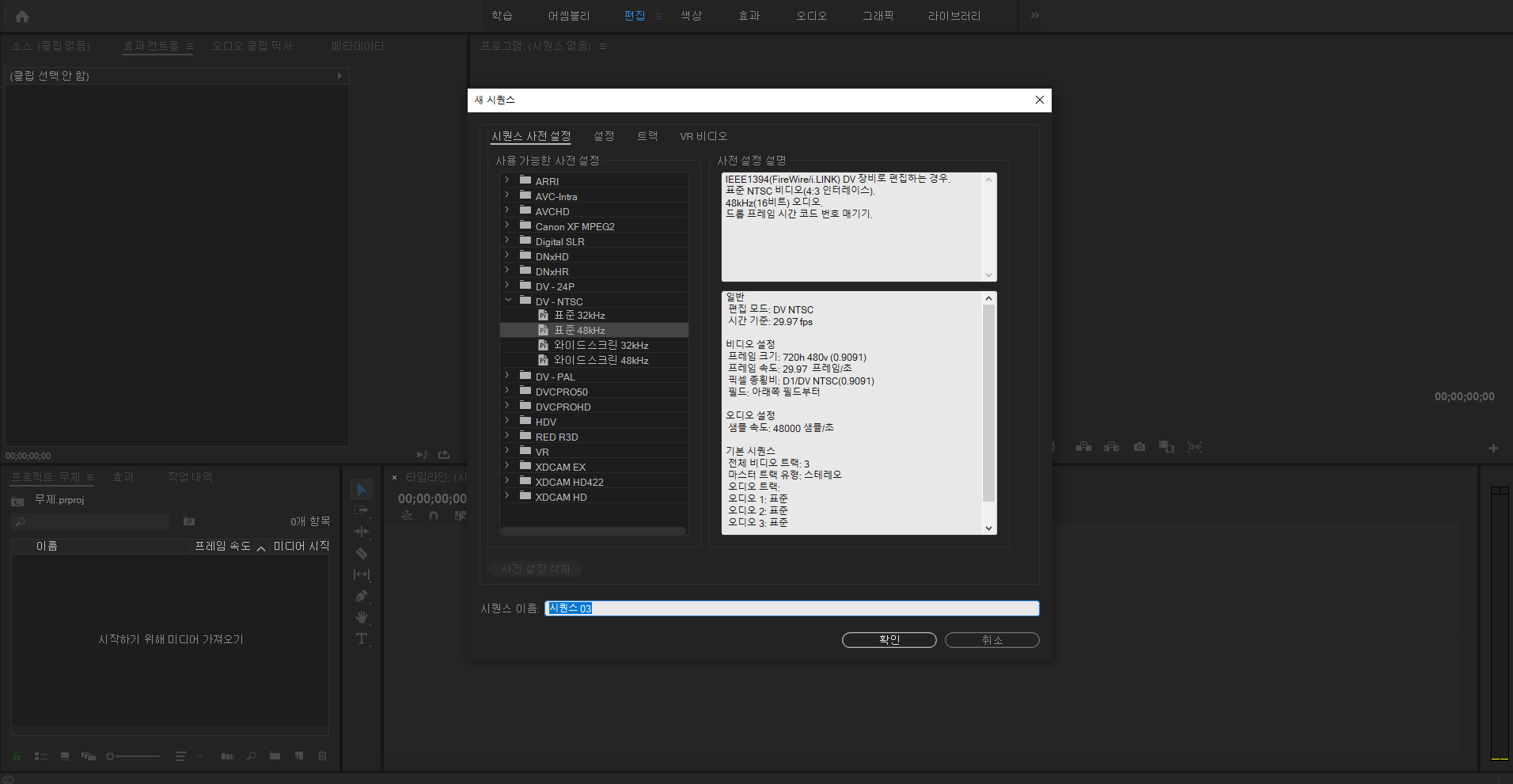 프리미어 프로 2019 한글 버전입니다. 영문도 같이 표시되어 있습니다.