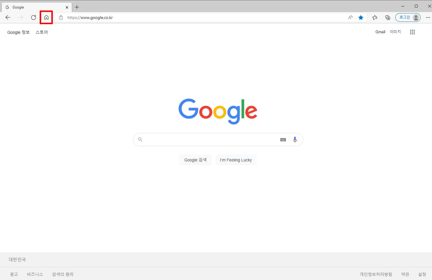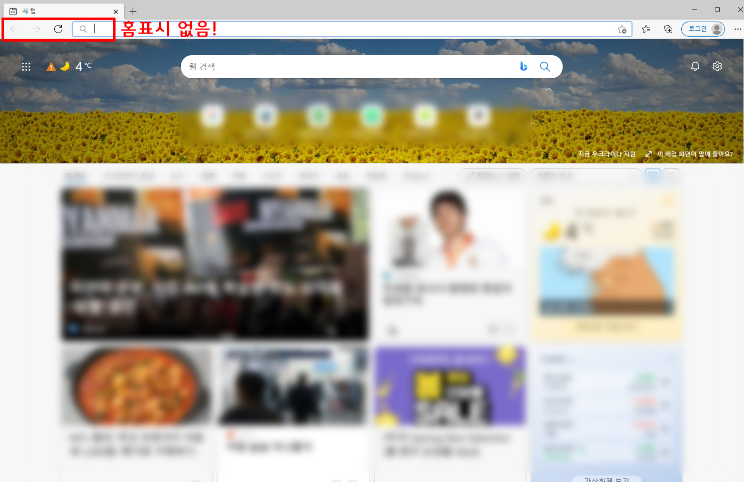 처음 윈도우 설치 시 엣지 브라우저에 [홈버튼]이 없는 상태로 나타날 거예요.