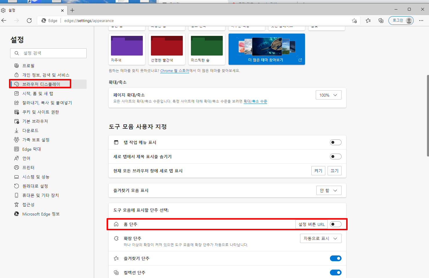3. [브라우저 디스플레이] 선택 후 [홈 단추] 활성화