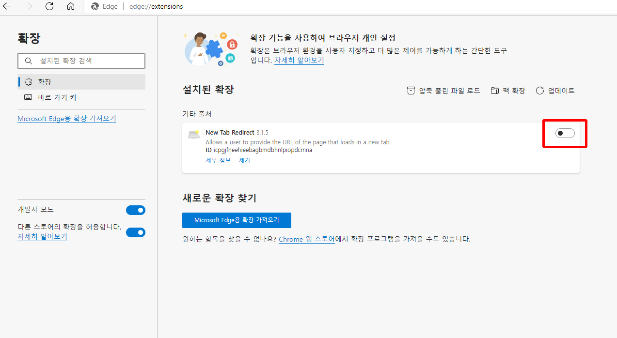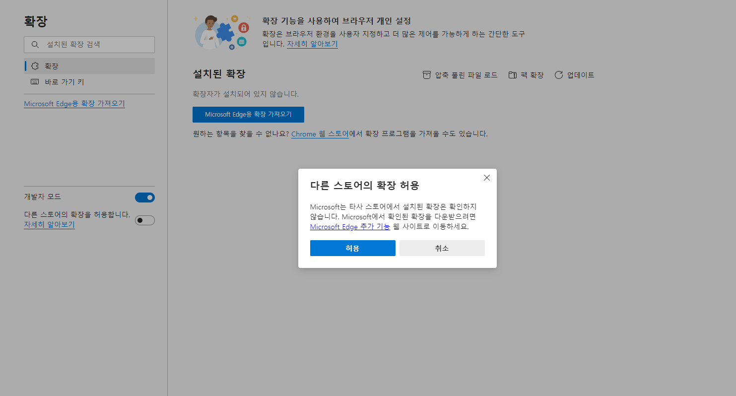 2. [확장]에서 [개발자 모드]와 [다른 스토어의 확장을 허용합니다]를 활성화 시켜줍니다.