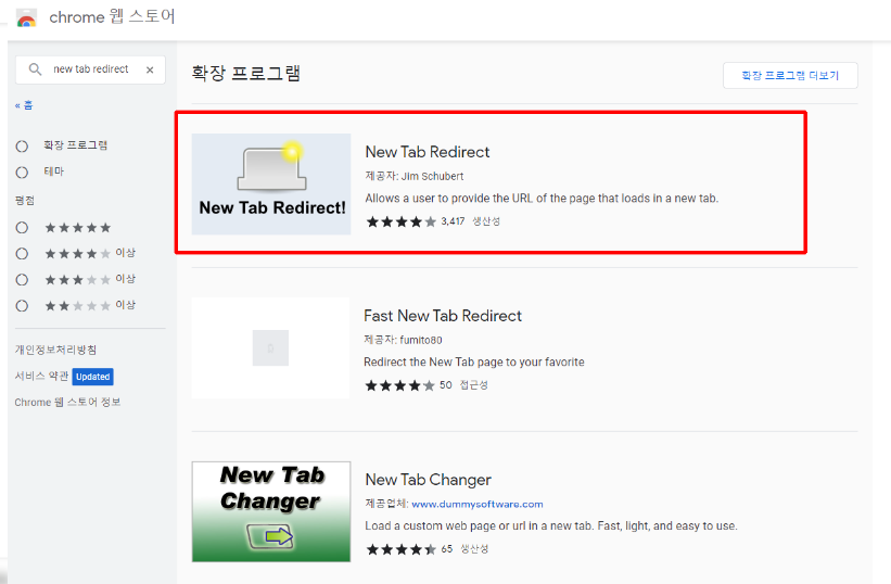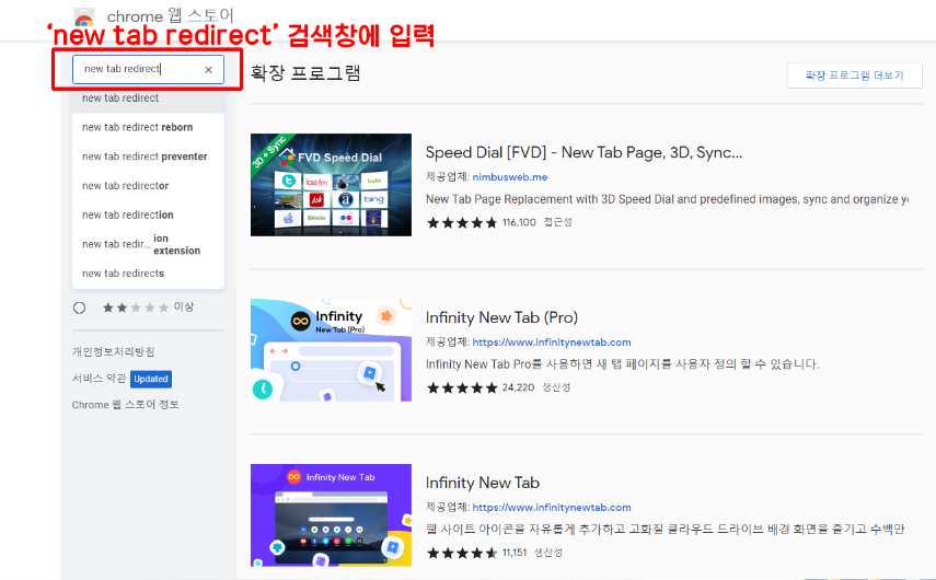 4. [chrome 웹 스토어]에서 검색 창에 'new tab redirect' 검색.