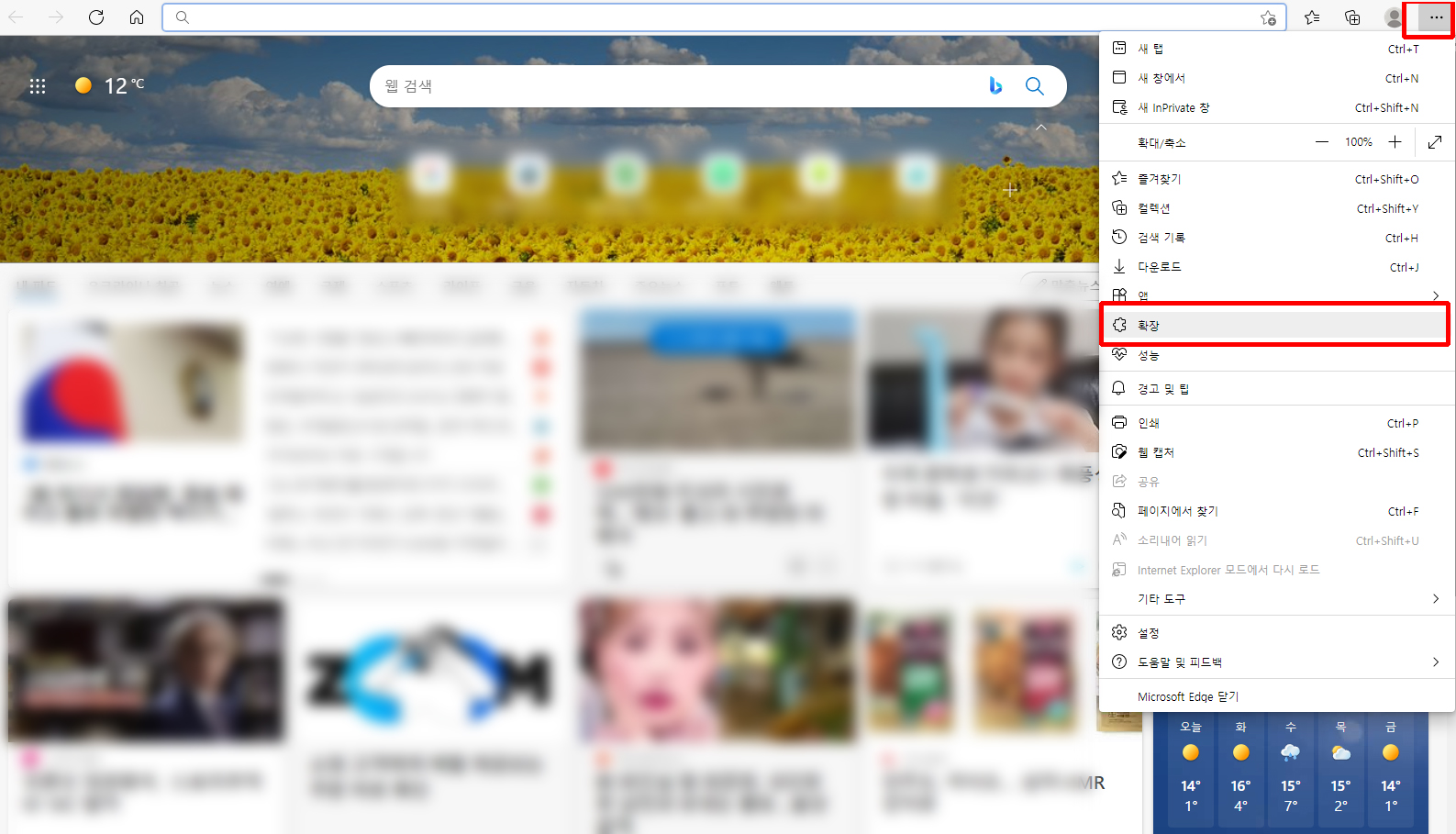 8-1. 다시 엣지 브라우저로 돌아와서 오른쪽 상단의 [···]을 클릭한 후 목록에서 [확장]을 클릭합니다.