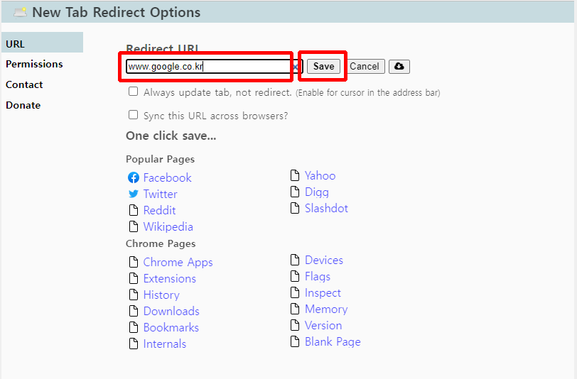 8-2. 텍스트 박스에 시작 페이지로 설정할 URL 주소를 입력 후 [Save] 클릭!