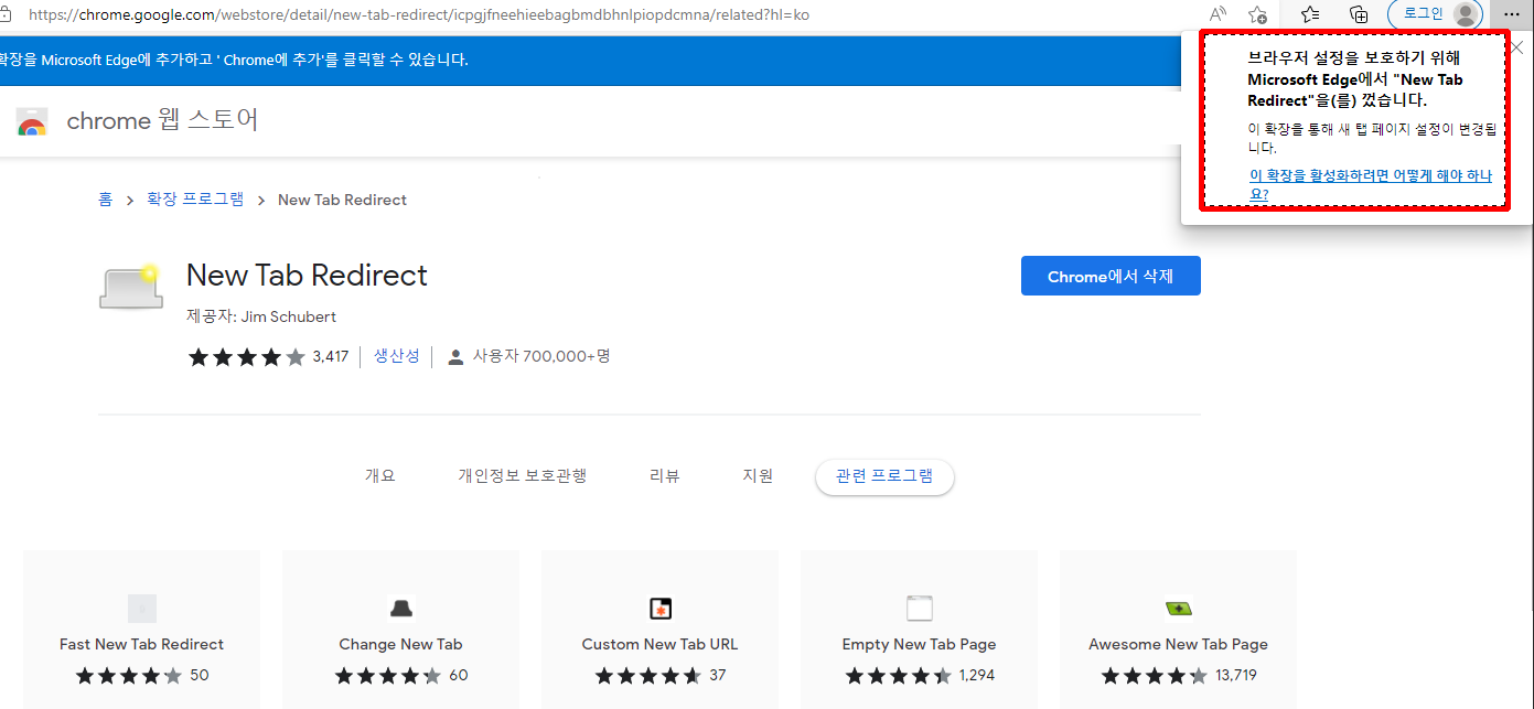 '브라우저 설정을 보호하기 위해 Microsoft Edge에서 "New Tab Redirect"을(를) 껐습니다.'