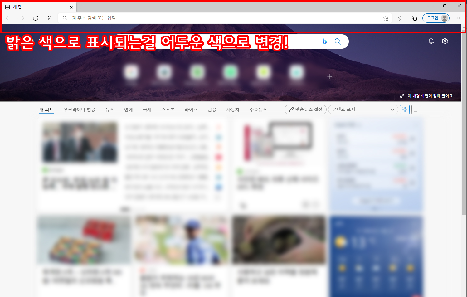 윈도우 엣지 테두리색이 밝은 회색이 기본 설정인데 저 부분을 어둡게 만드는 것입니다. 흔히 다크 모드라고 많이 불리는 방식이에요.