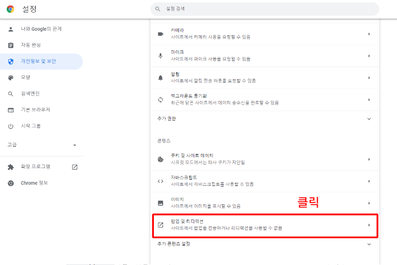 [팝업 및 리디렉션] 클릭.