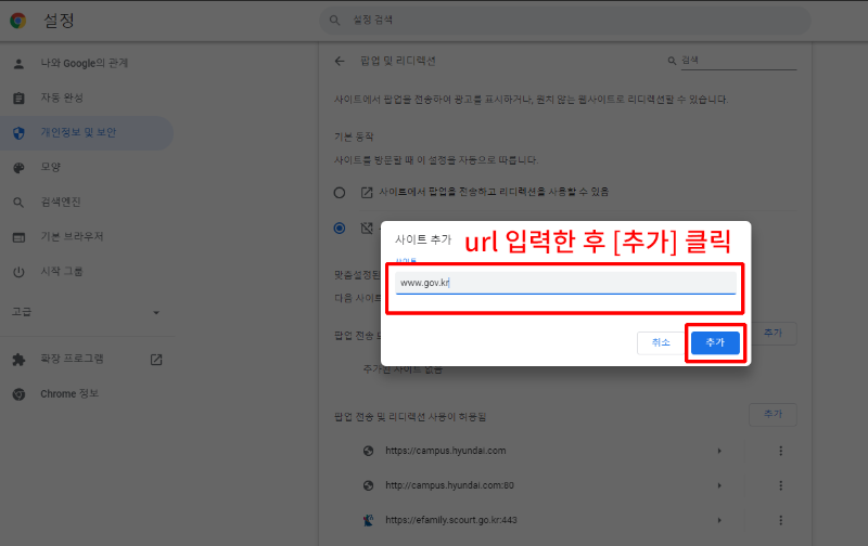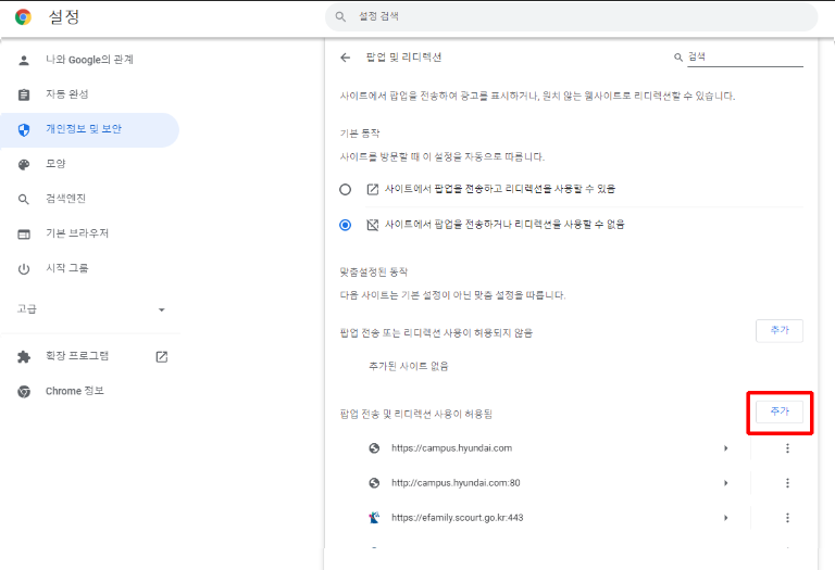4. [팝업 전송 및 리디렉션 사용이 허용됨] 항목의 [추가] 버튼을 클릭.