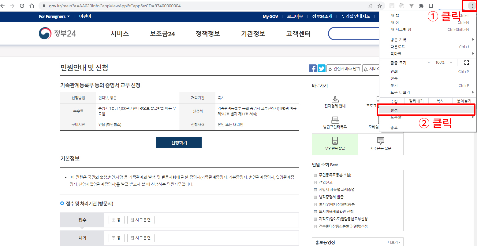 정부24 (민원24)에서 가족관계 증명서를 한통 프린트하려고 하는데 [신청하기] 버튼 클릭 시 새 창이 뜨는 거 같더니 바로 사라지는 현상이 나타났어요. 그러면서 아무 동작도 안됨!