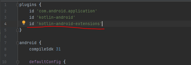 id 'kotlin-android-extensions' <- 이 내용이 빠져있는데 추가해준다.