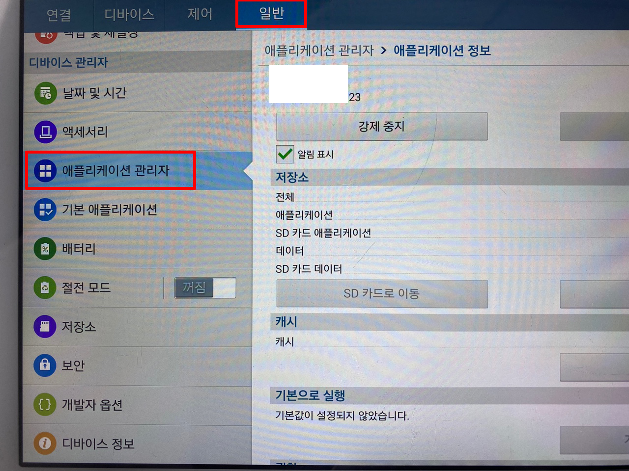 2. [일반] - [애플리케이션 관리자] 클릭하여 오른쪽에 삭제할 앱 항목 선택.
