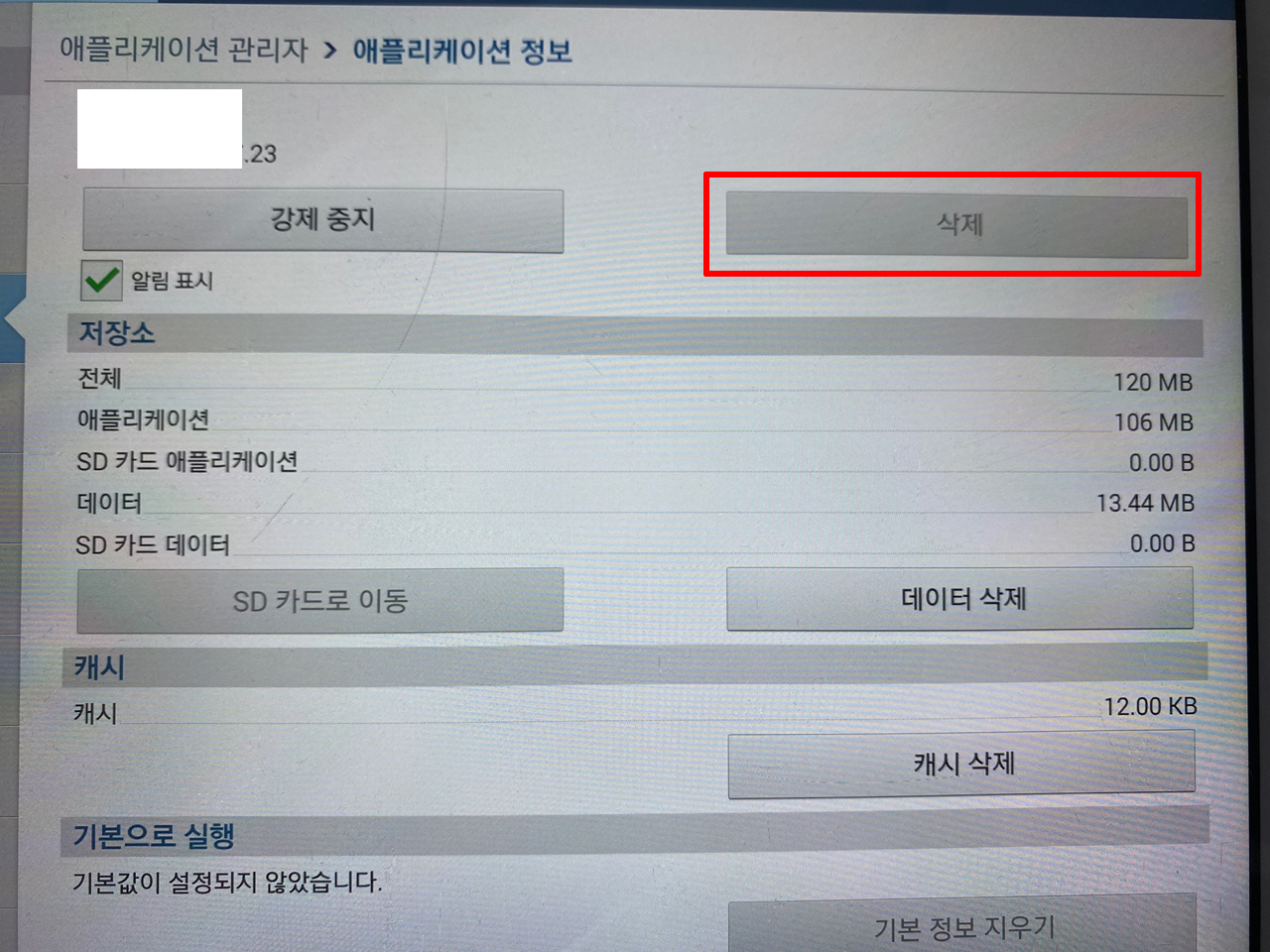 7. 다시 [애플리케이션 관리자]에서 삭제할 앱을 선택하면 [삭제] 버튼이 활성화되어있음.