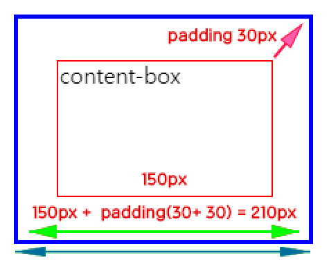 실제 컨텐츠(150px) + padding-left(30px) + padding-right(30px) + border-left(3px) + border-right(3px) = 216px가 된다.